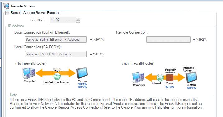 This approach streamlines deployment of the viewer application and execution. However, in situations where an operator requires multiple panel views, an executable file is required for each panel remote IP address. This can result in many duplicate copies of the same Remote HMI viewer app with a different filename. This approach also assumes either VPN or port-forwarding capability on the remote network. This also limits the usability of using simultaneous Remote HMI client in cases where the remote C-more panels may have a duplicate or overlapping IP address space across multiple sites, requiring the operator to properly control the remote VPN connectivity to ensure the correct site is being routed, or mapping different TCP ports on the Firewall/Router port-forwarding configurations.