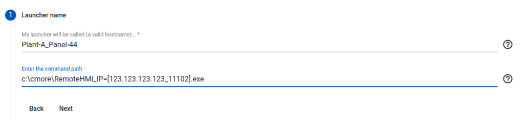 In this case, we specified a command path of : C:\cmore\RemoteHMI_IP=[123.123.123.123_11102].exe