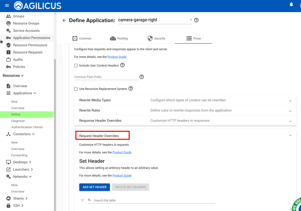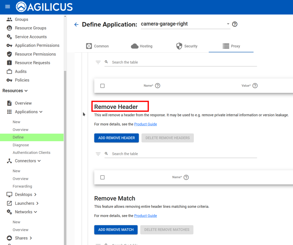 Configure the camera as an application as normal. However, the Hikvision has a limitation on the number of HTTP headers, breaking it with modern browsers. To solve this, we will use the Agilicus AnyX Web Application Firewall to remove unused headers. The specific headers I am removing include:
