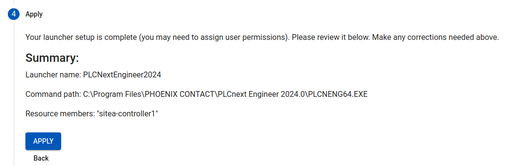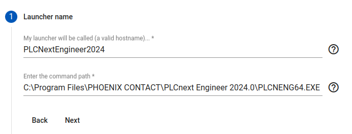 Assign a name to the launcher, e.g.: PLCnextEngineer2024 and specify the valid path to the actual executable (not the shortcut). The default installation path will be:
