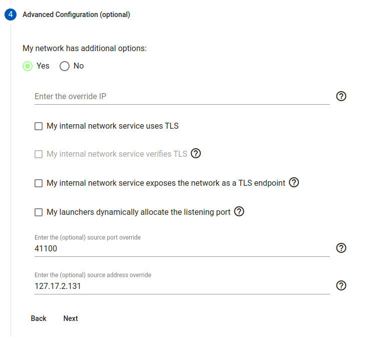 In Step 4, Select Optional parameters to specify additional options. In this step, we will add “source port override” settings at the bottom of the menu. Keep the standard TCP port of 41100 .