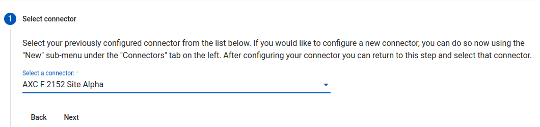 In Step 1, select the appropriate connector where the remote controller is deployed. In this example, we are selecting a connector installed on a PLCnext AXC F controller at a remote site.