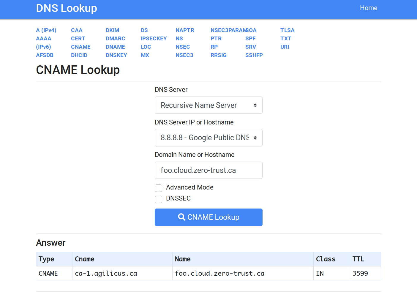 $ dig -t cname foo.cloud.zero-trust.ca ; <<>> DiG 9.16.6-Ubuntu <<>> -t cname foo.cloud.zero-trust.ca ... ;; QUESTION SECTION: ;foo.cloud.zero-trust.ca. IN CNAME ;; ANSWER SECTION: foo.cloud.zero-trust.ca. 3600 IN CNAME ca-1.agilicus.ca.