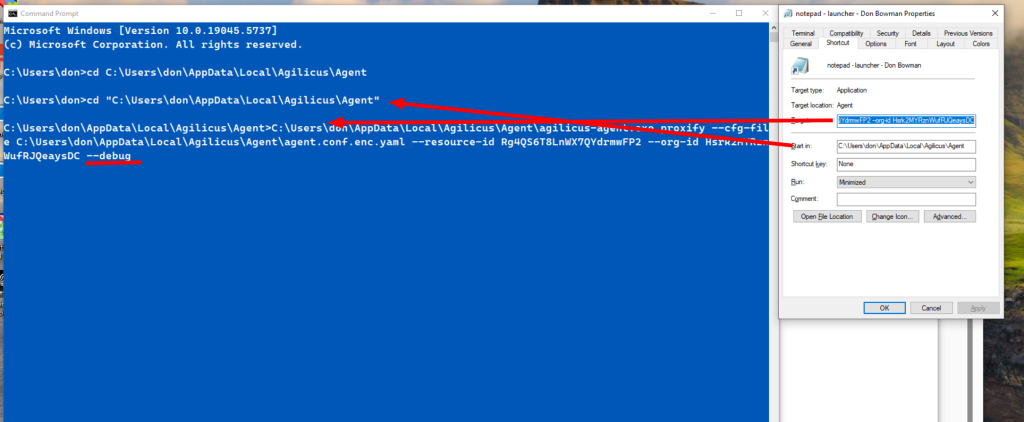 C:\Users\don\AppData\Local\Agilicus\Agent>C:\Users\don\AppData\Local\Agilicus\Agent\agilicus-agent.exe proxify --cfg-file C:\Users\don\AppData\Local\Agilicus\Agent\agent.conf.enc.yaml --resource-id Rg4QS6T8LnWX7QYdrmwFP2 --org-id Hsrk2MYRznWufRJQeaysDC --debug