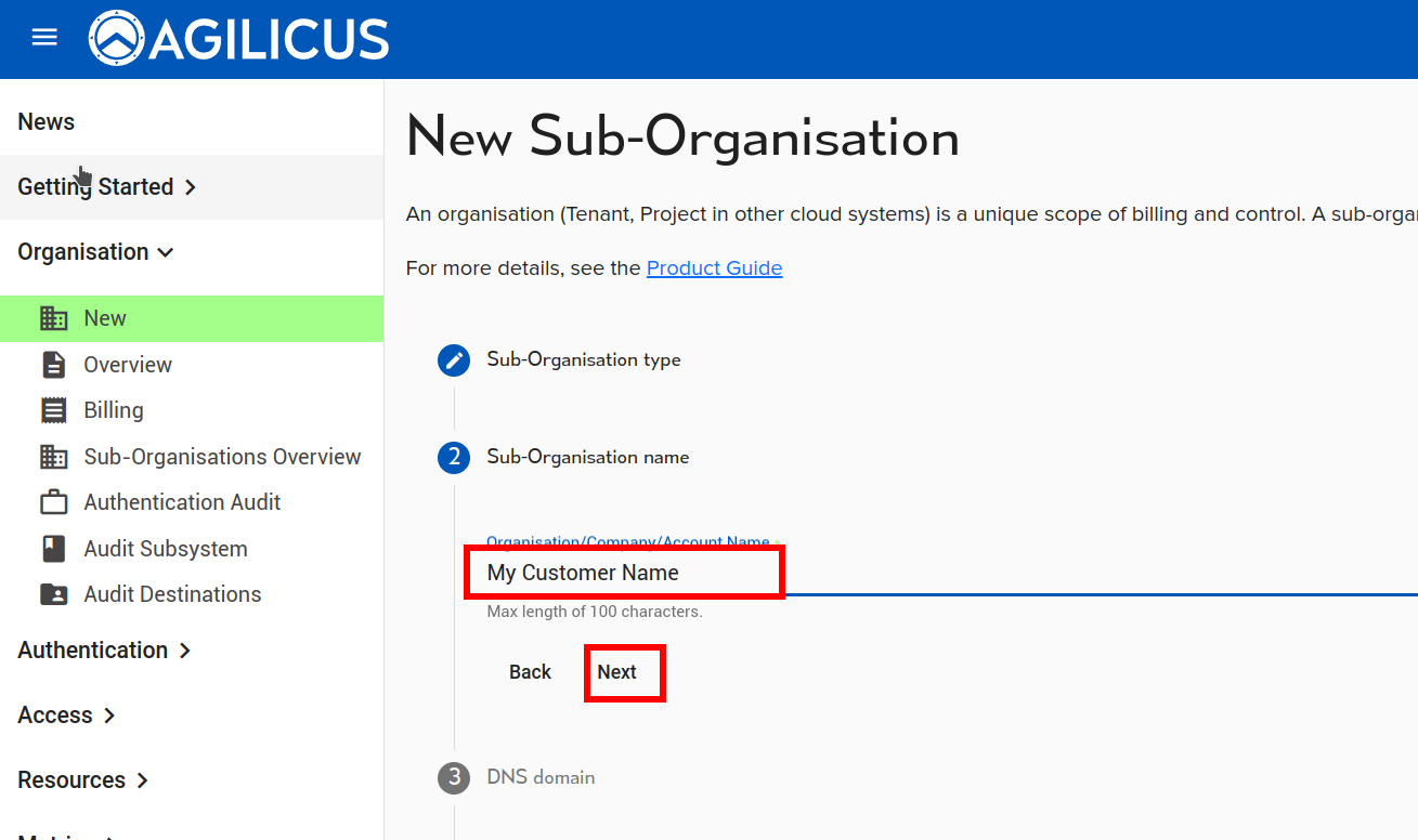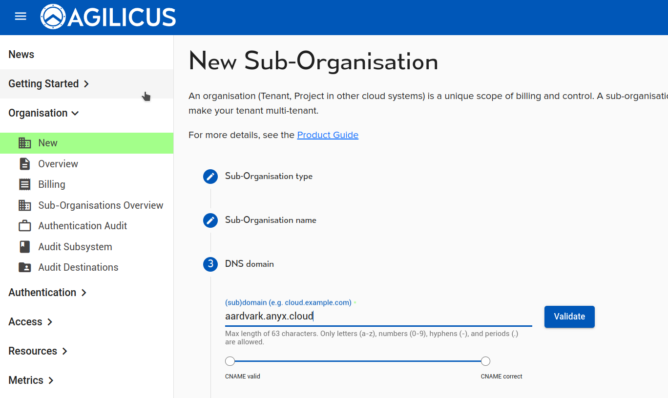 Now enter the DNS name you have chosen. This should be setup as a wildcard CNAME pointing to Agilicus (e.g. *.THISDOMAIN -> __REGION_DOMAIN_NAME__).