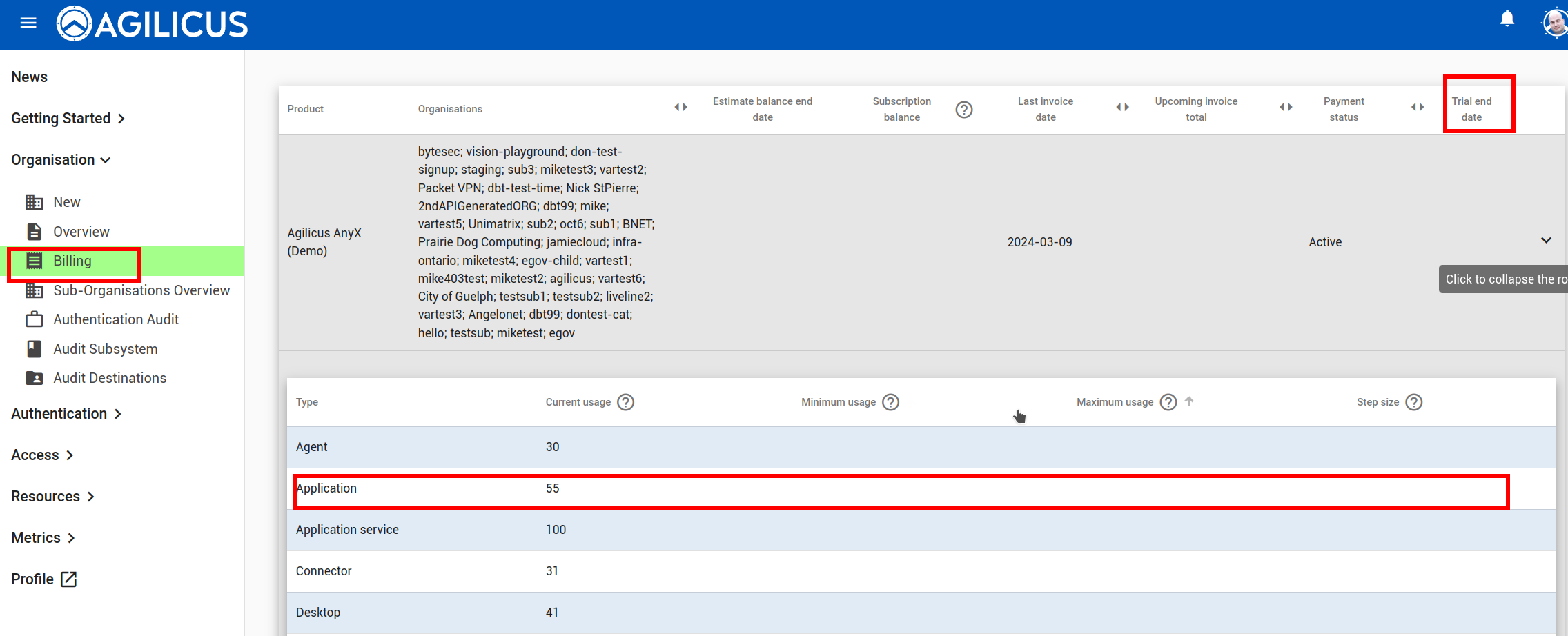 By default, each new setup has a 25-day trial. You can see the trial dates and usage volumes on the Organisation/Billing page. There will be one row per customer.