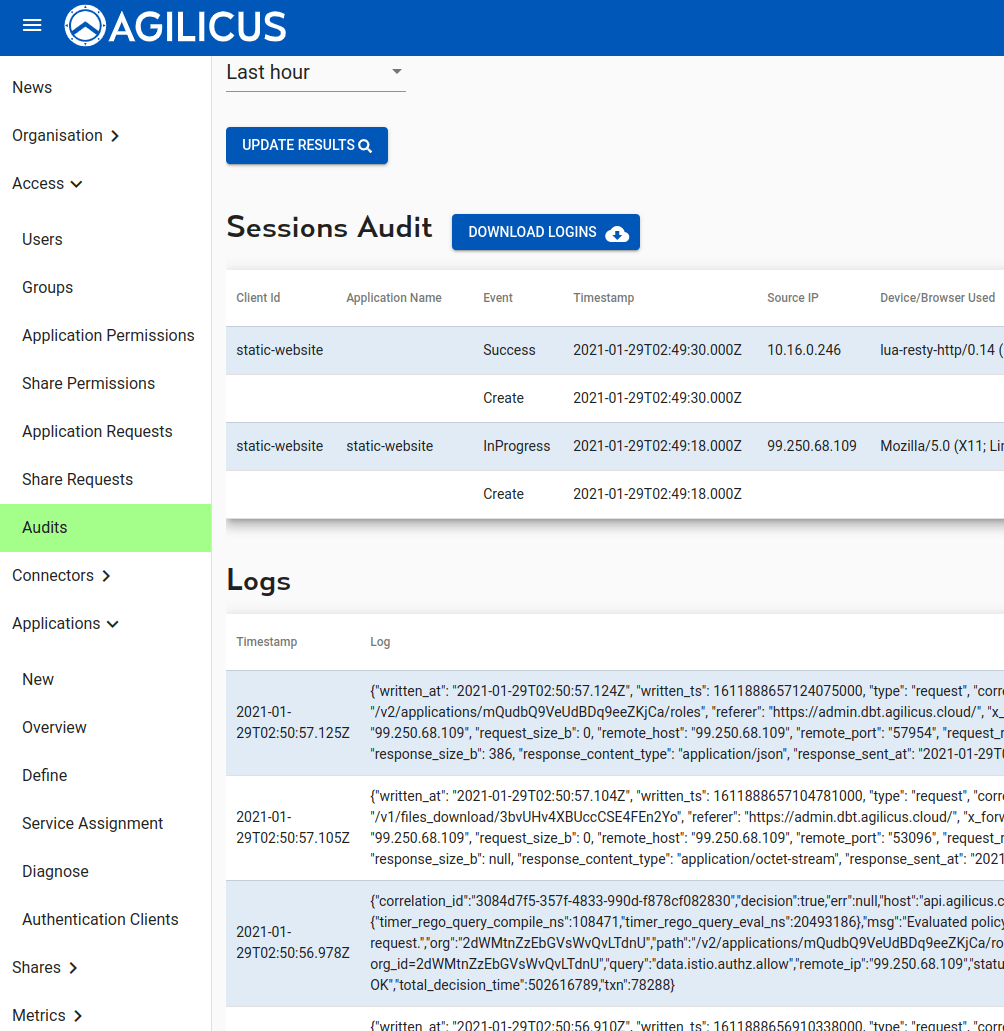 - the user audit screen will show your accesses: each session, each HTTP transaction. This is cryptographically secure, based on a JWT on each transaction: no IP/port matching.