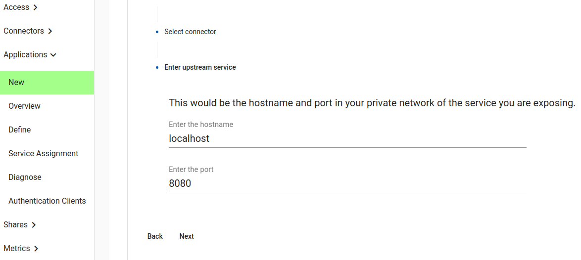 Now we will select how the application upstream connection works. We will access the simple static web site from onsite (emulating e.g. your corporate wiki or vacation planner)