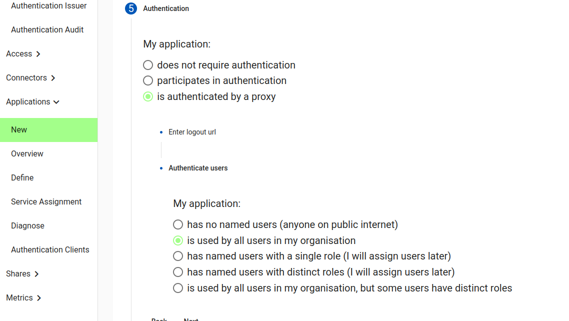 Here we will choose “Is authenticated by a proxy”. This means the Agilicus Platform will automatically handle authentication and authorisation. Your application will receive pre-defined headers with the username and user roles. No unauthenticated user traffic will arrive at your application.