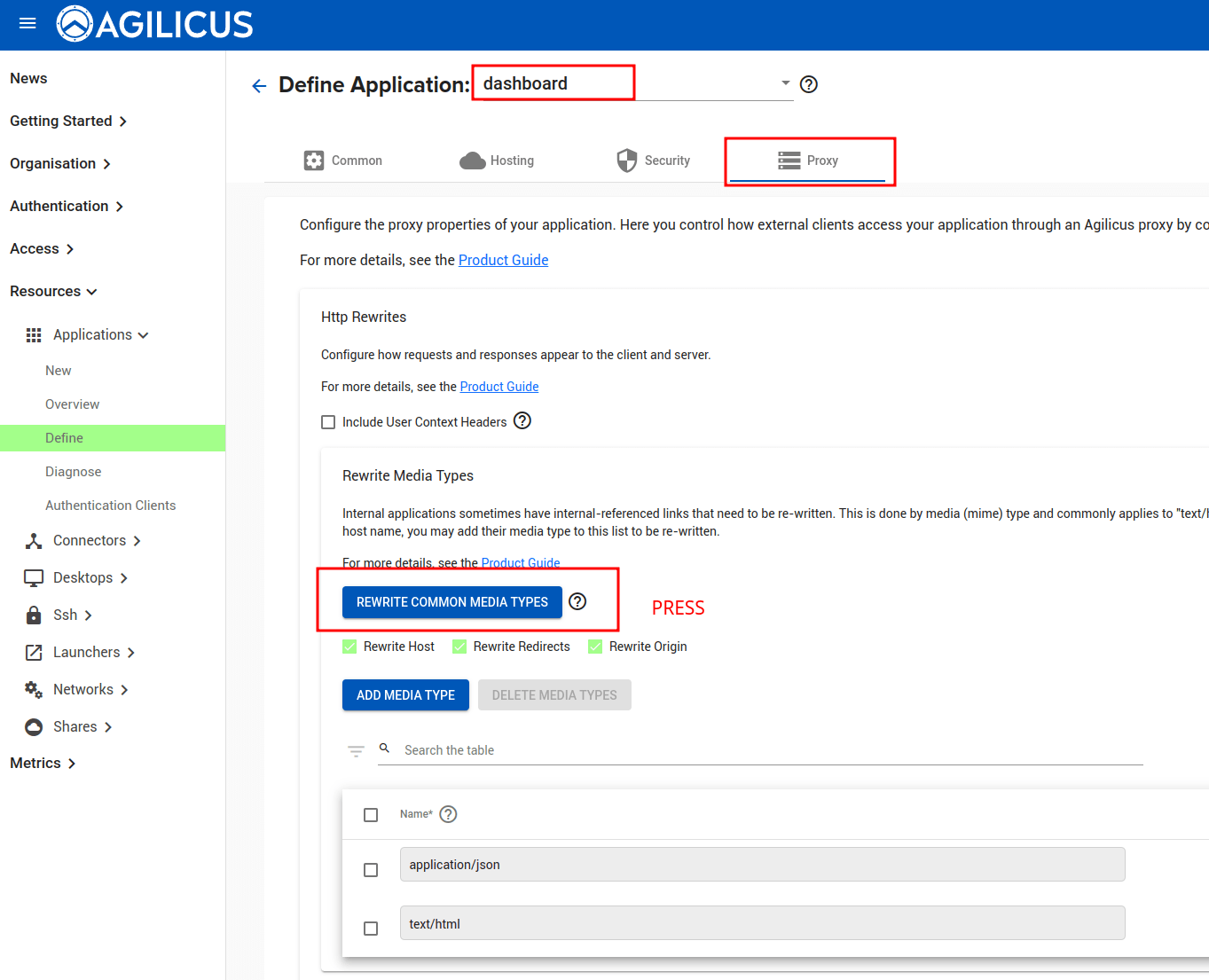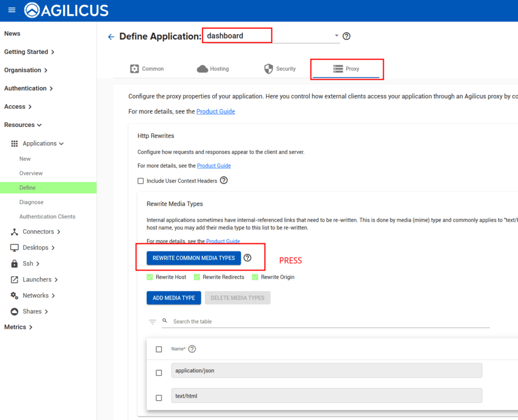 Once you have completed the New Application Stepper, navigate to the ‘Define’ screen to refine the setup. On the ‘Proxy’ Tab, enable ‘Rewrite Common Media Types’.