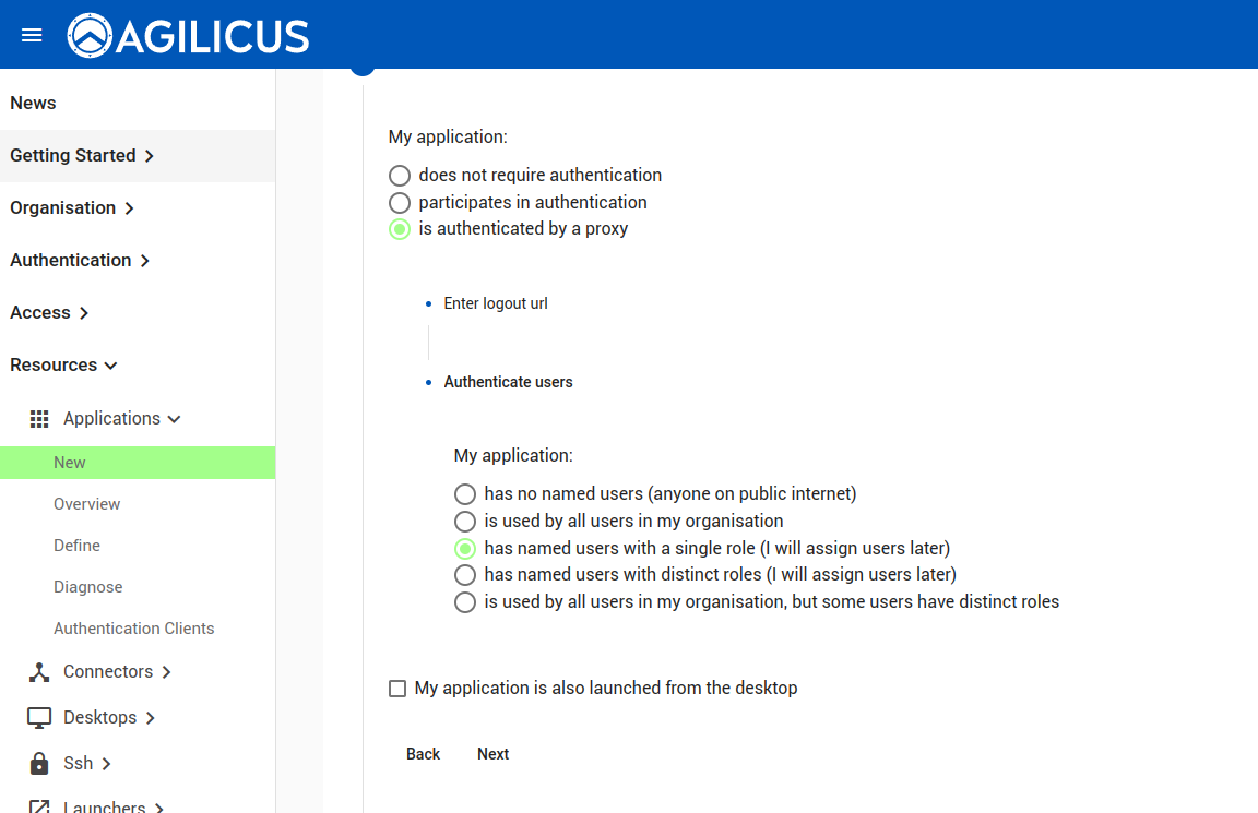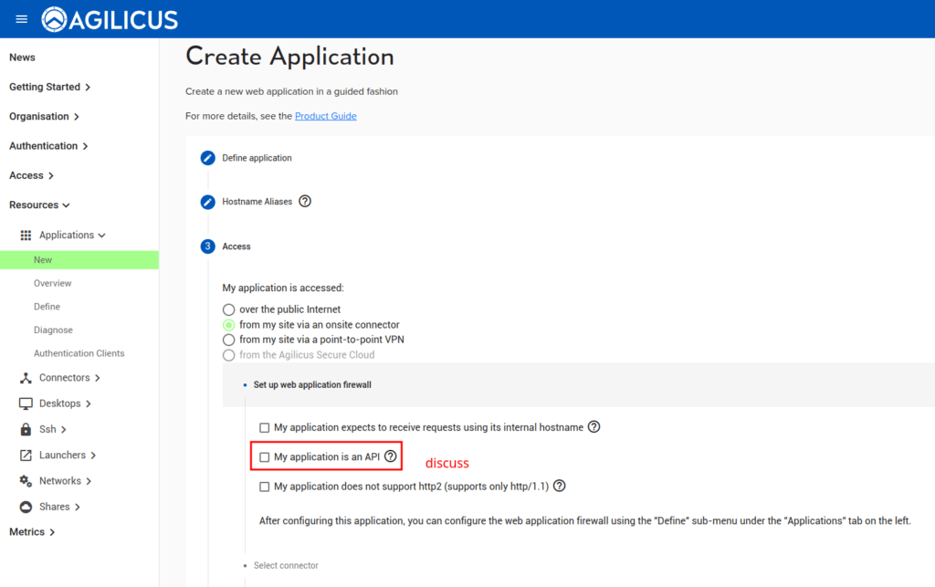 In this example, we first create an application. On the 3rd step, “My Application Is An API”… if your API correctly uses CORS, you can leave this as-is. Else consider setting it, or example the ‘Define’ step later for more configuration.