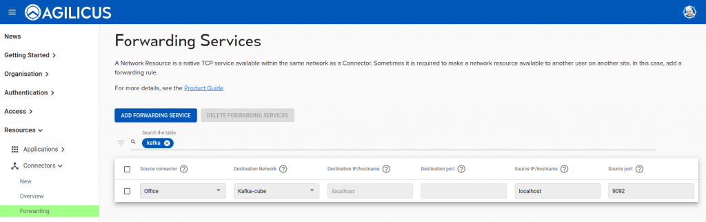 - Create Service Forwarder, source-connector == Office, Destination-network == kafka-cube, source-ip localhost, source-port 9092