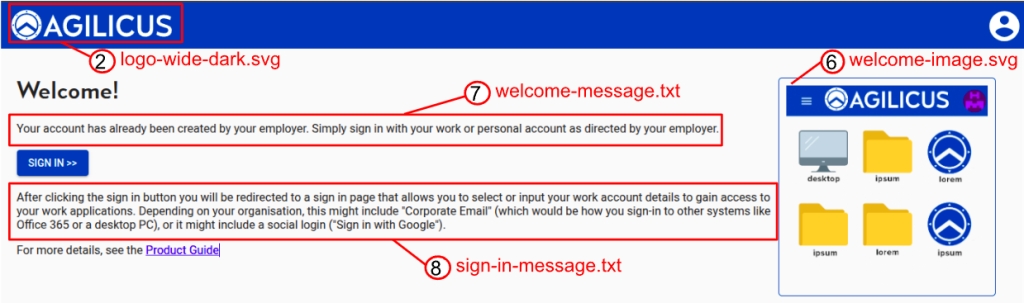 - logo-wide-dark.svg. This should be rectangular in size. This will show in Profile and Authentication screens in place of the Agilicus logo. We recommend a transparent background, and a foreground that will look proper with a blue background (#0057b8).