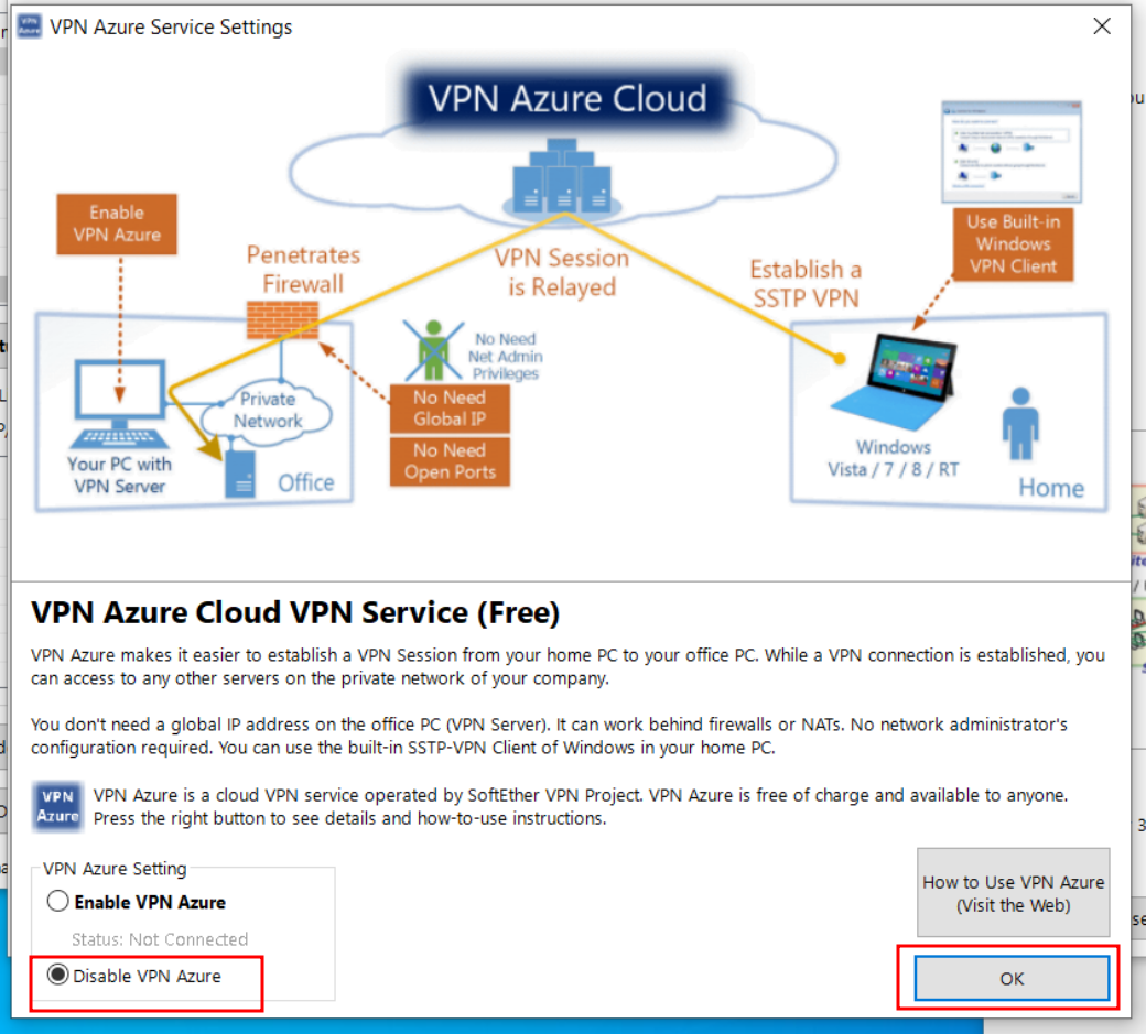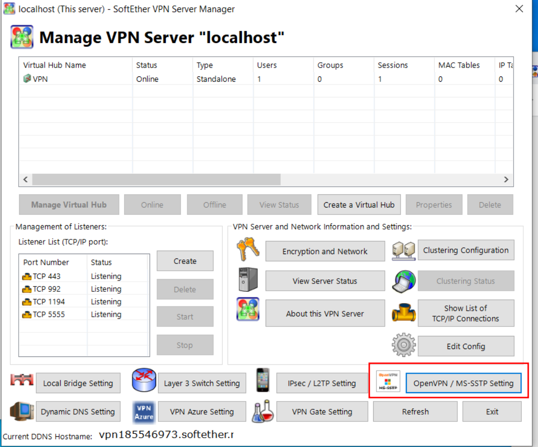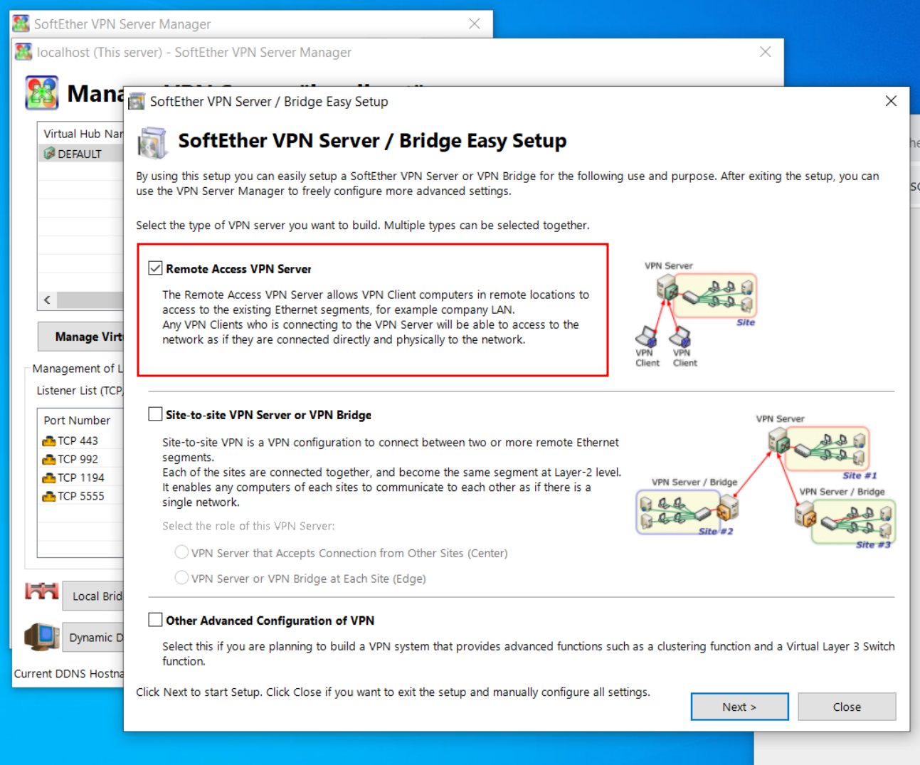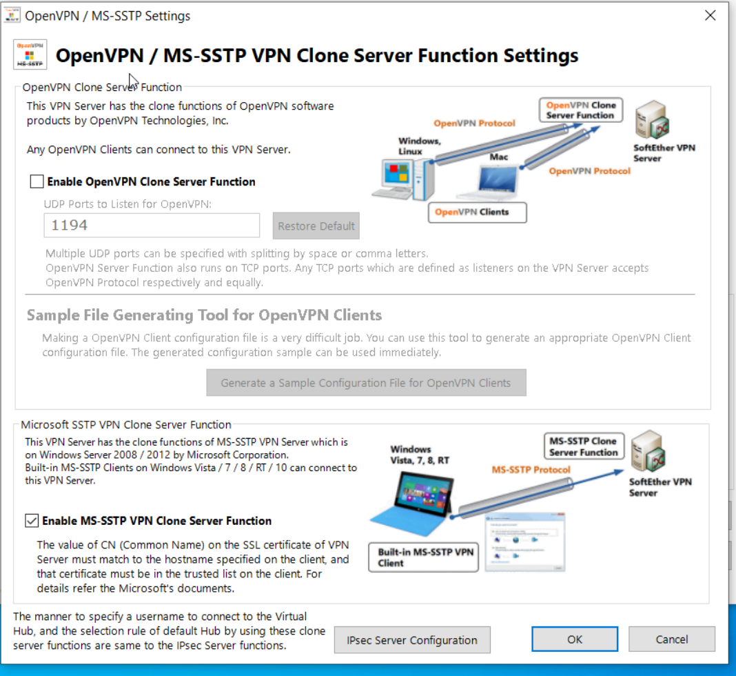 In this example write up I will use SoftEther VPN. We provide some example configurations for it, but ultimately you can configure it however you wish and responsible for ensuring its setup correctly for your environment. The SoftEther SSTP VPN allows both bridged and routed (NAT) environments, you may use the bridged environment if there is a DHCP server on the same subnet, in which case the client will appear as local.