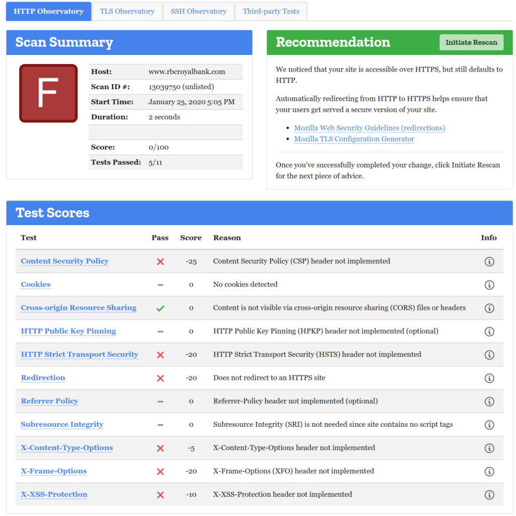Let’s start with a real example. My bank. The Royal Bank of Canada. We’ll head over to the Mozilla observatory here. To my (sadness? no-surprise?) it gets an F. None of the basic protections are enabled. Now, I’m sure some will say, it probably gets better once you login. Maybe?