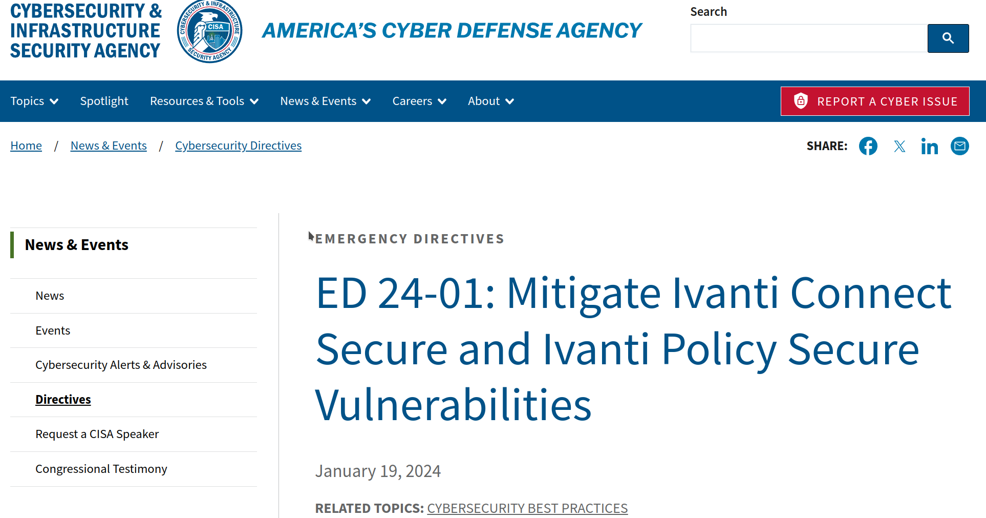 In Emergency Directive 24-01 agencies are directed to remove the affected Ivanti Industrial VPN products from service, wipe them, wipe all clients who have used it, reset all identities which have used it. A big ask in a hurry for a big problem which is really happening rather than theoretically might happen.