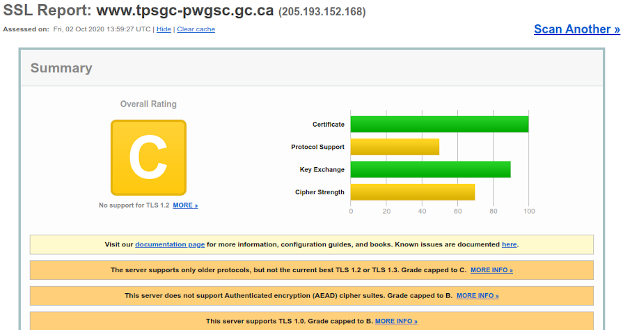 Imagine my surprise when I was looking up something on data protection, and am unable to read the link on the Government of Canada website. They are serving it with TLS 1.0. I am unable to open this (since Chrome 86 won’t allow it). Now, I say unable, the actual error would allow me to override. Don’t. You don’t want to get in the habit of “this is very unsafe, do you want to anyway?”. Just assume that a website that has bad encryption is a rabid skunk-porcupine hybrid carrying a rusty blade. Back away.