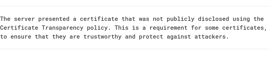 Recently a team mate ran into an issue. His browser would not let him proceed to a site he had just setup, with a valid certificate. We use Let’s Encrypt (and our sites are all in the HSTS preload so they must be TLS). Nonetheless, he was presented an error “The server presented a certificate that was not publicly disclosed using the Certificate Transparency policy. This is a requirement for some certificates, to ensure that they are trustworthy and protect against attackers.” What could be wrong?