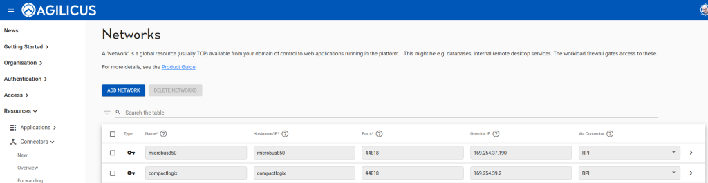 - Create a ‘Network’ resource for each PLC in the Agilicus with optional hostname creation (optionally make a Resource Group per site containing all Network Resources )