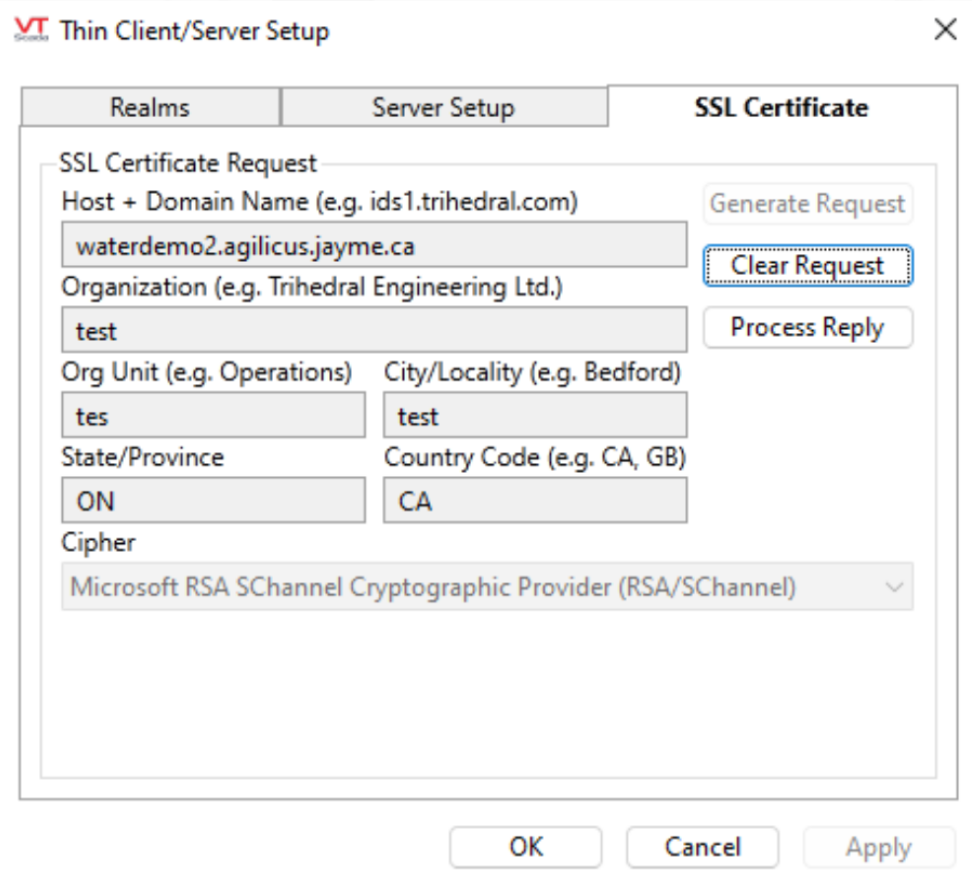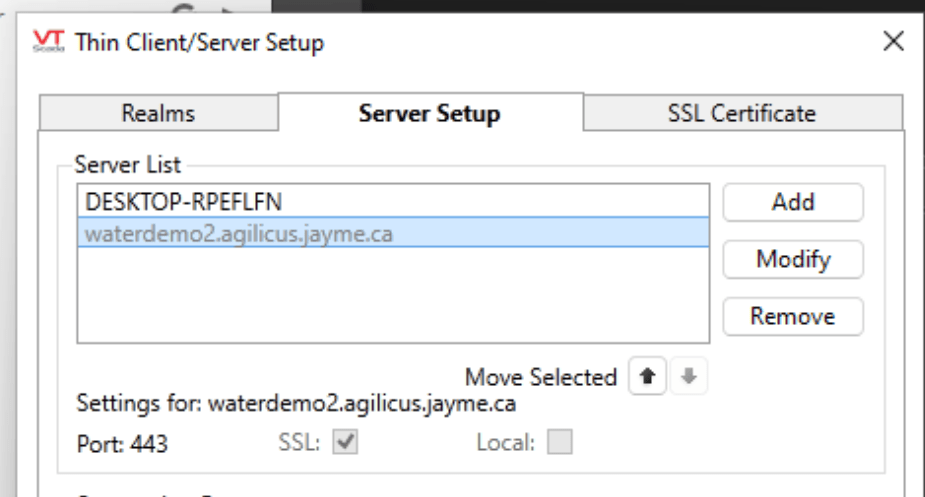In the “Thin client/Server setup” menudialog, select “Connection Addresses” and configure the Agilicus external server name exactly as previously configured in the Agilicus Application stepper (in this case, the waterdemo FQDN). Make sure to check the “Secure” checkbox and specify port 443.