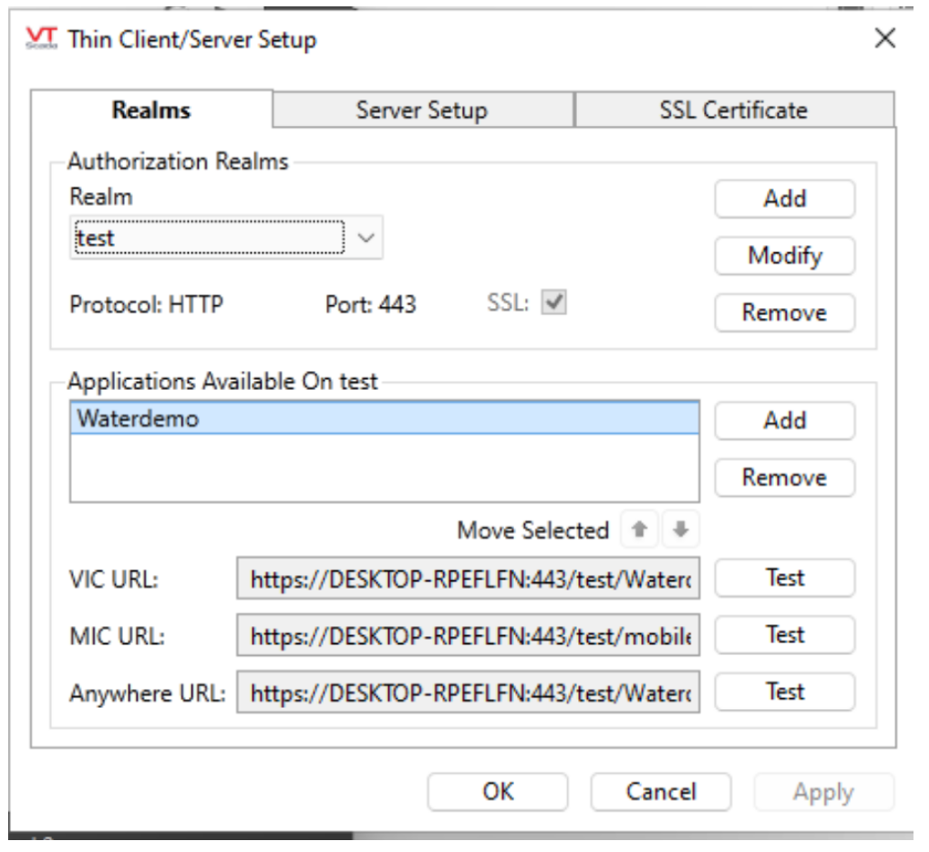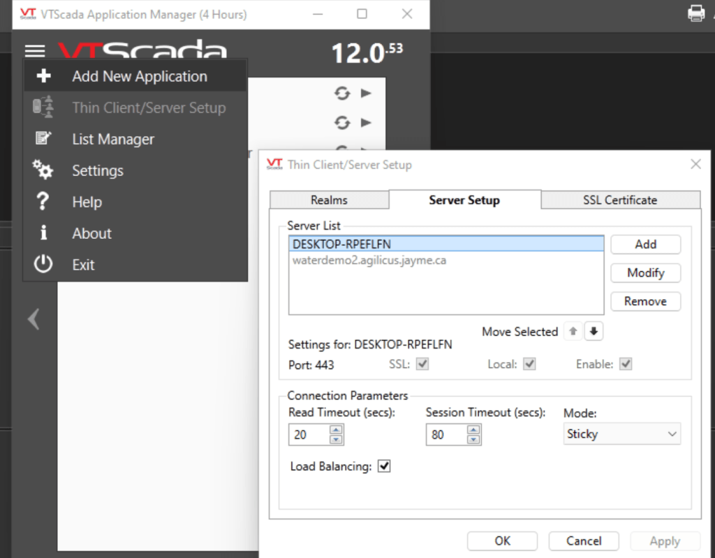 - The VTScada “Connection Addresses” dialog tab of thin client manager must be configured with a host entry that matches exactly the Agilicus configured application hostname in the Server List. In this walkthrough, we will be using the hostname “waterdemo.cloud.egov.city”