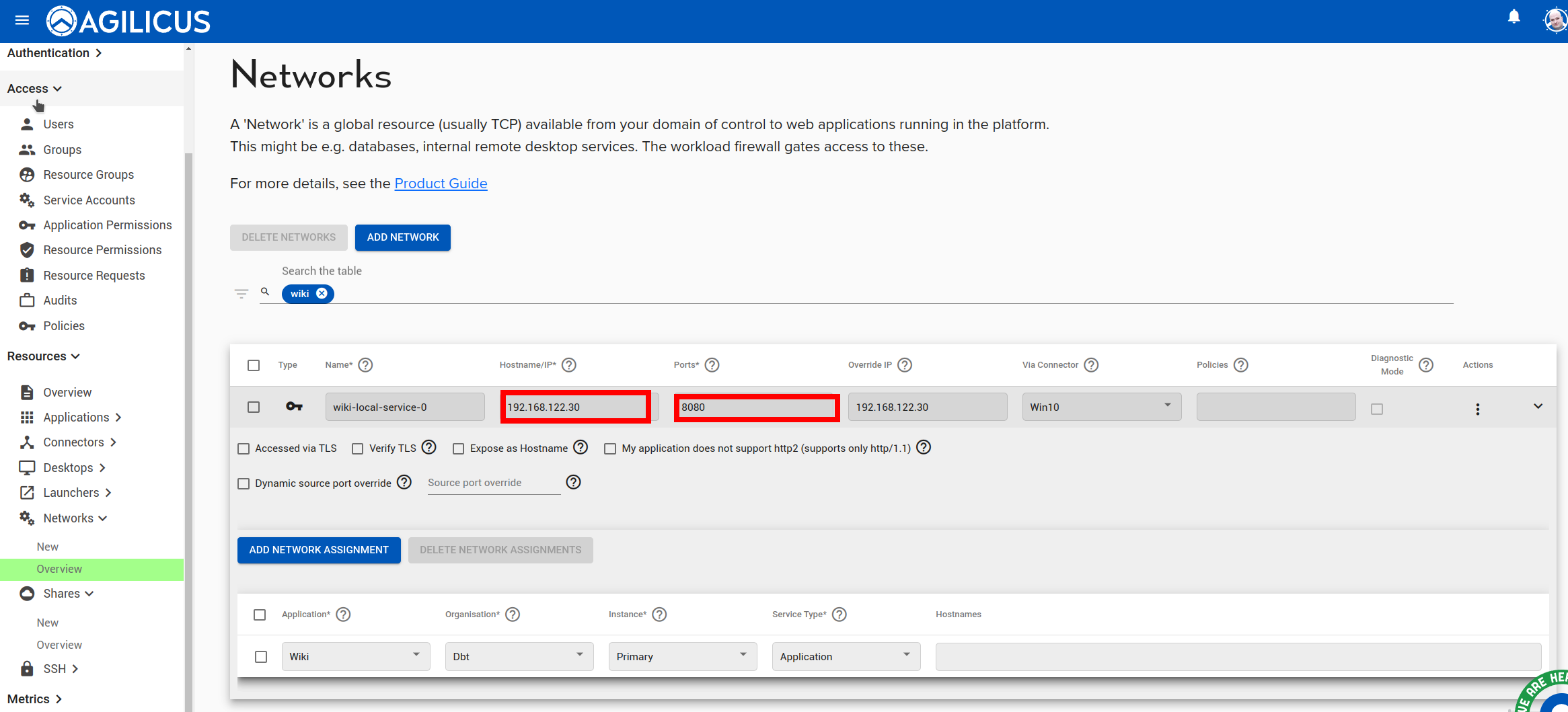 Web Applications use network resources. You can change where the network resource is accessed (either the connector it is bound to, or the hostname/IP/port that it is internally known as) by navigating to Networks/Overview.