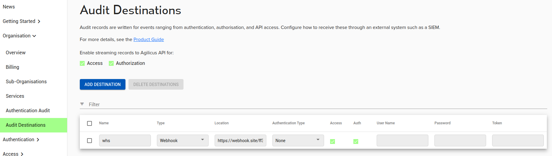 You may enable records from the Connector to come back to the Agilicus Cloud by enabling ‘Access’ and ‘Authorisation’ check marks in the Audit Destinations screen.
