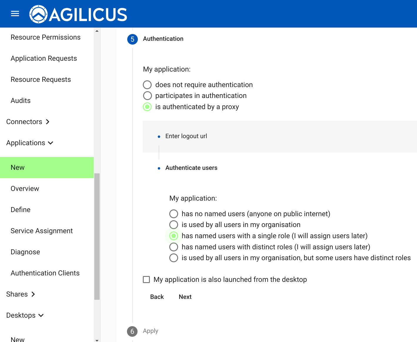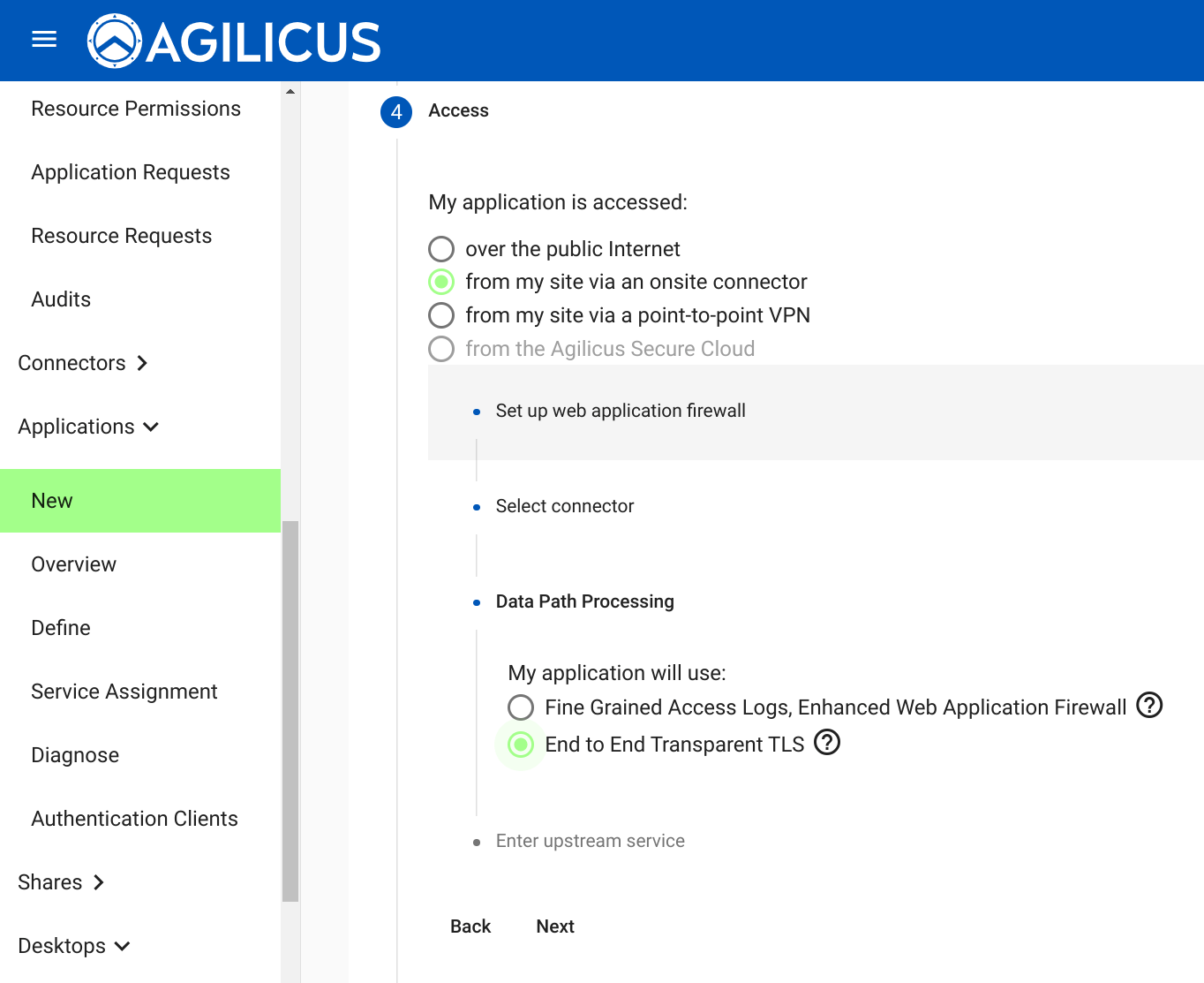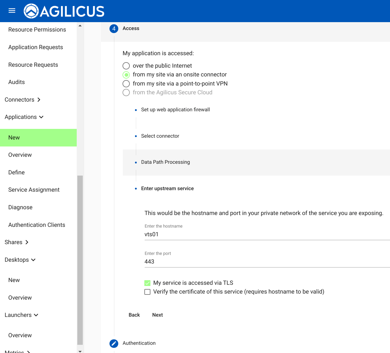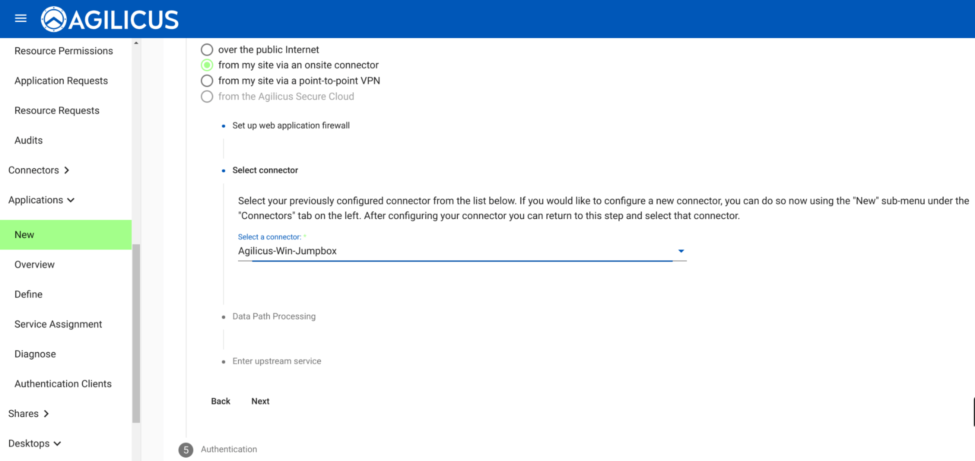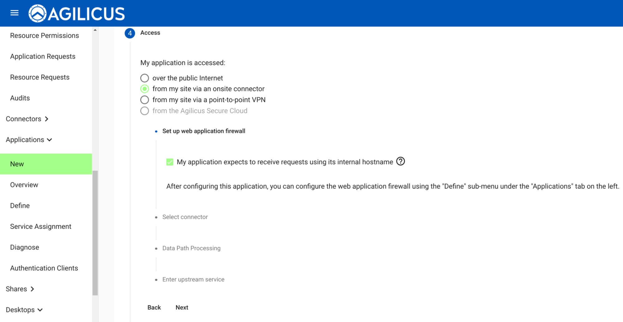 First under “My application is accessed” select “from my site via an onsite connector