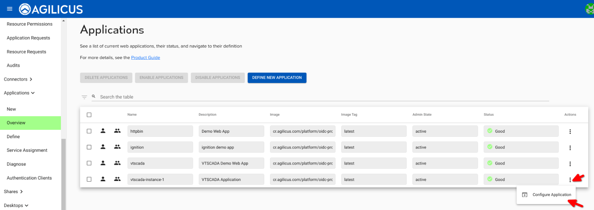 Click on “Overview” within the Applications section and select the Actions icon in the very far right hand side of the screen for the VTScada application that we just created: