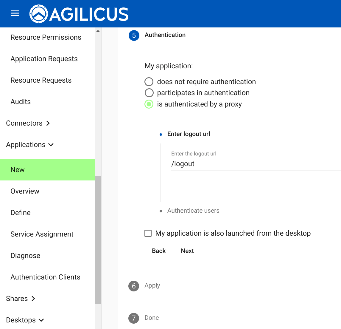 Select “is authentication by a proxy” and type in “/logout” (without the double quotes) into the “Enter the logout url” field.