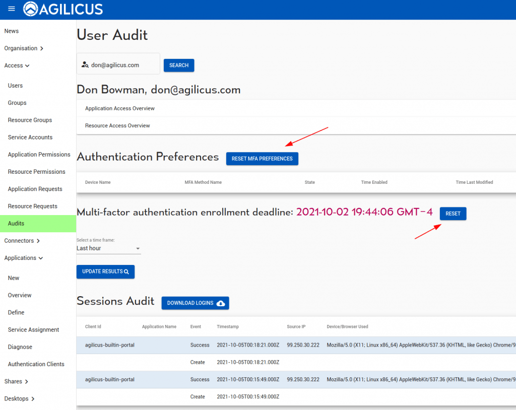 We can see the multi-factor sessions and preferences (as well as all other audit information) of a given user on the audits screen. Here too we can reset the trust-on-first-use timeline.