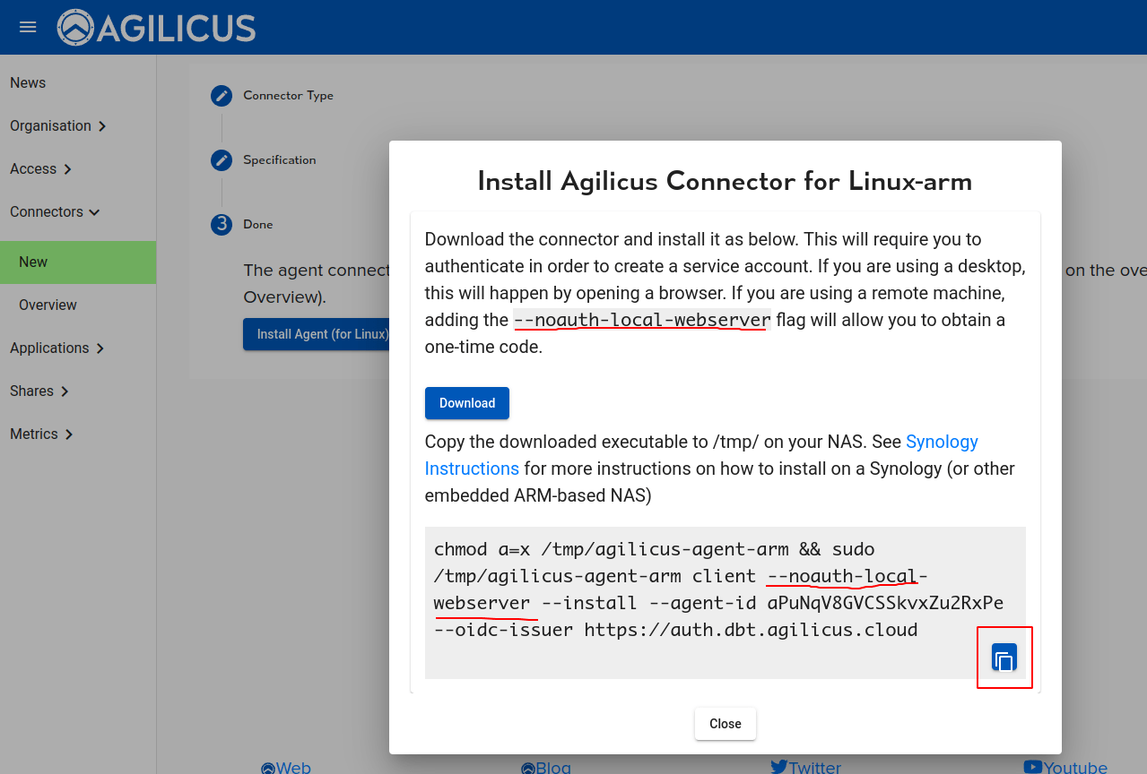 At this stage you are complete, you will see the Connector go online in the web interface in a minute or so.