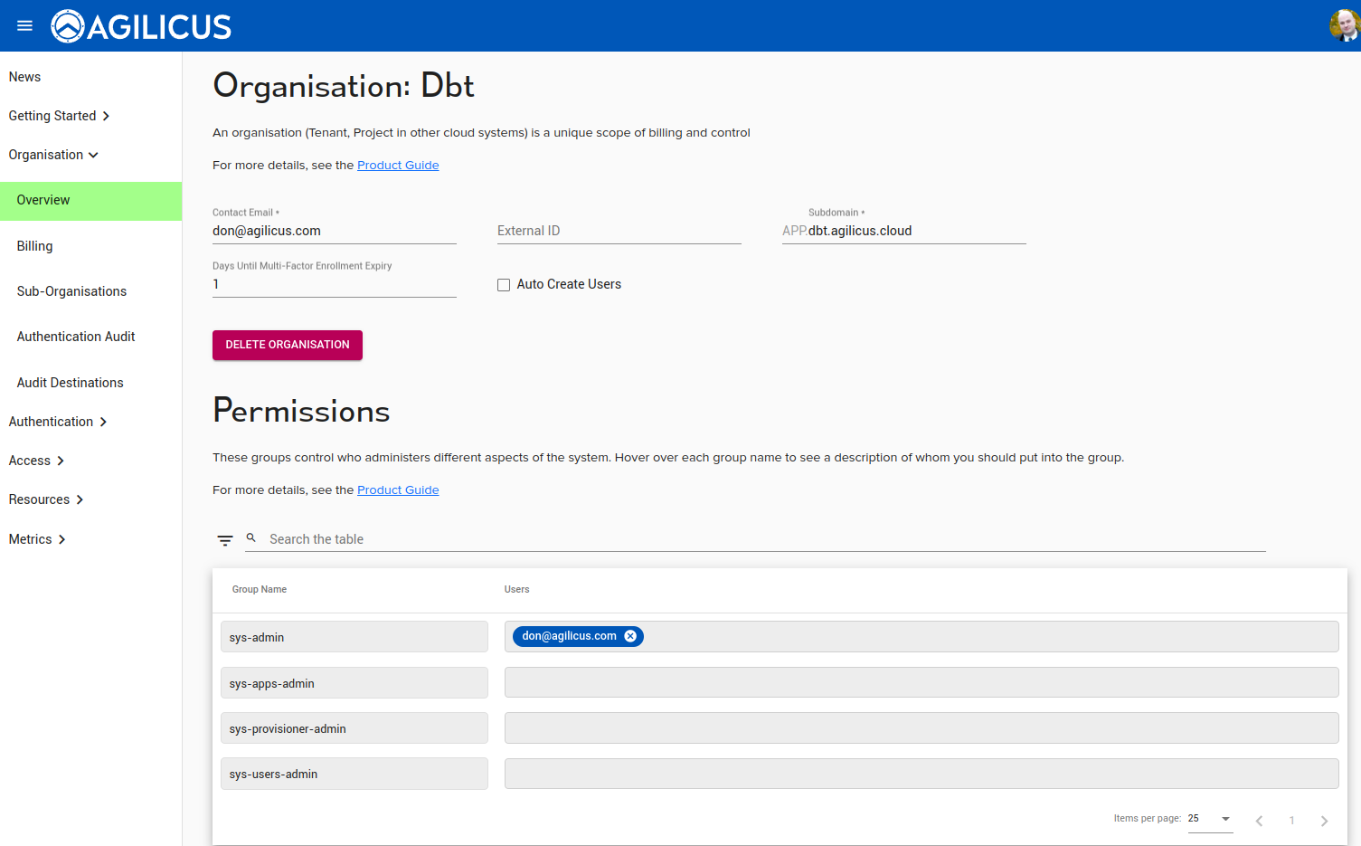 An organisation (tenant, project in some other systems) is a span of control, of permissions, of users. Each organisation has:
