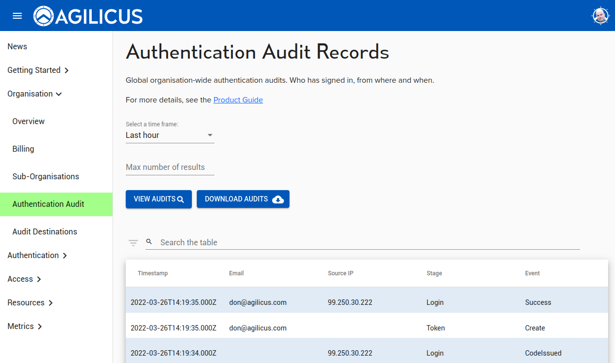 Each organisation has a set of authentication audit records, indicating who has created an Identity Token (authenticated), from where, when, etc.