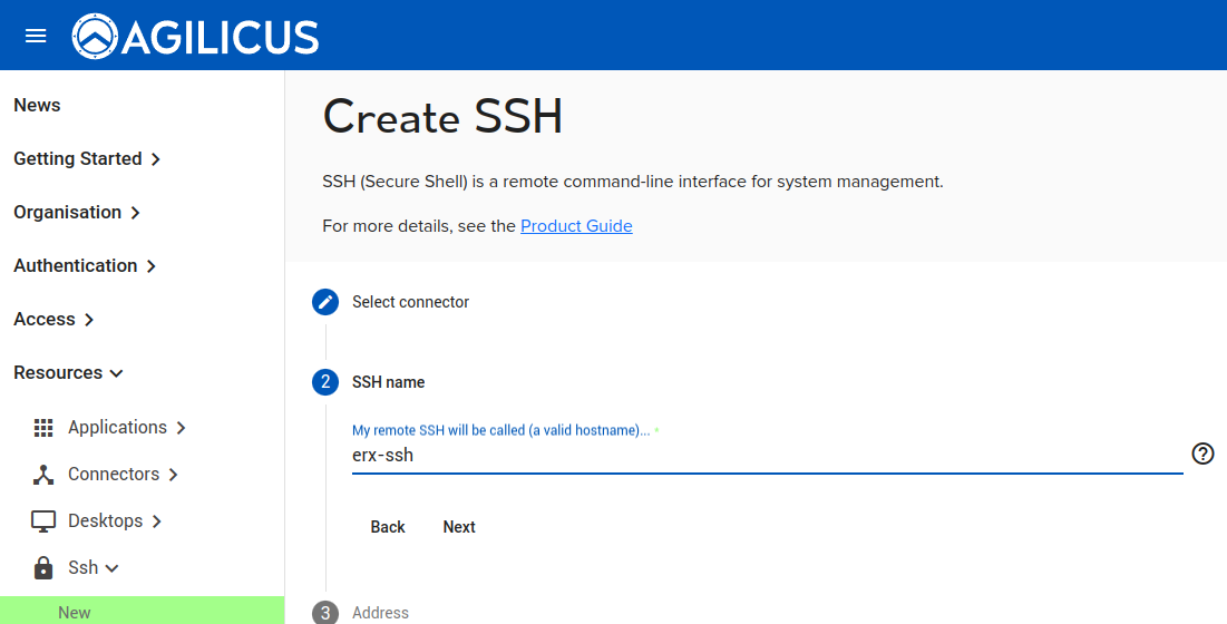 2. Create a name for the SSH resource. This will appear as a valid hostname and must be unique within your sub-domain. Feel free to use a pattern, e.g. ‘site-host-ssh’.