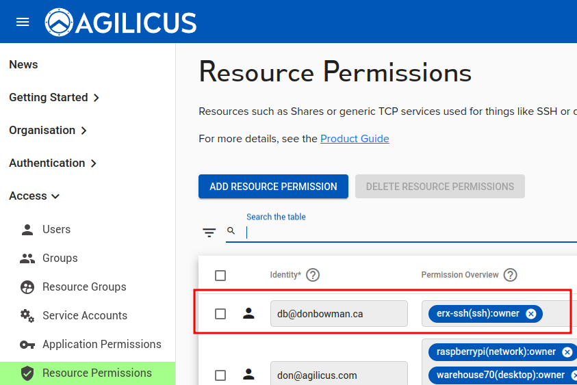 We must now assign ‘Owner’ permission to each user or group that should be able to connect. See “Resource Permissions” for more information.