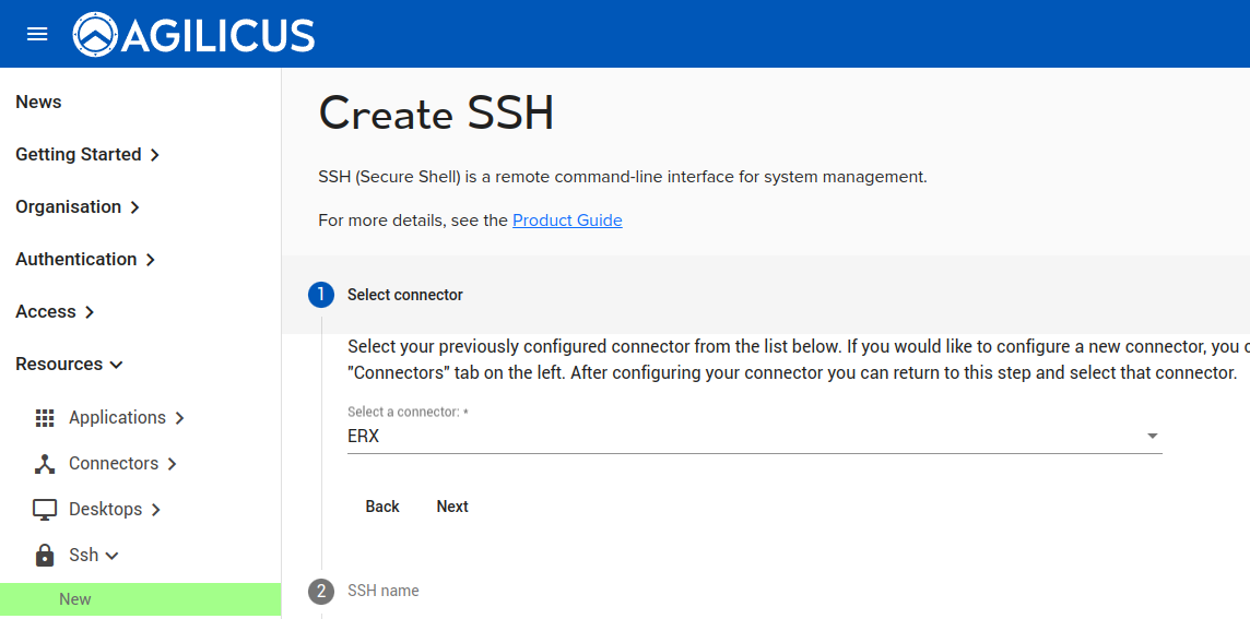 1. Select the connector (the site on which the underlying SSH resource exists)