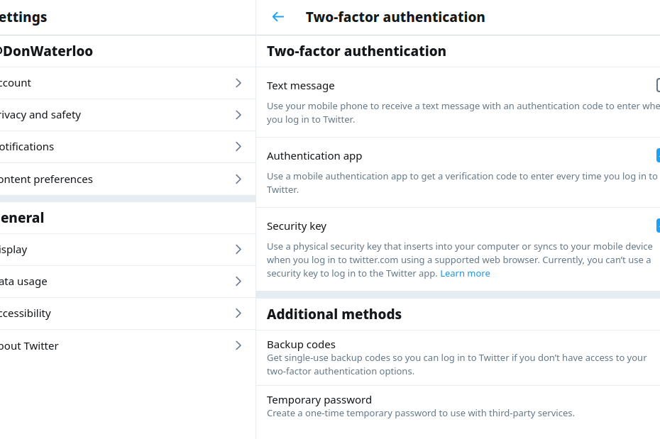 Before you read on, I encourage you to head over to your Twitter Two-Factor Authentication screen and disable “Text message” as a method (relying on your TOTP application and your Security key).